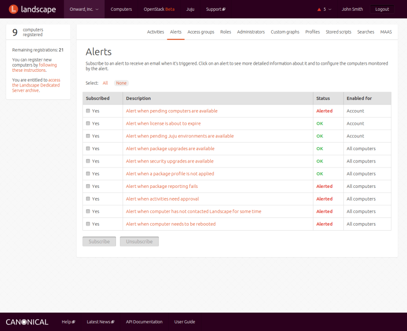 The Alerts screen shows the status of each alert. If an alert has not been tripped, the status is OK; if it has, the status is Alerted. The last column notes whether the alert applies to your account (pending computers, for instance, are not yet Landscape clients, but they are part of your account), to all computers, or to a specified set of tagged computers.