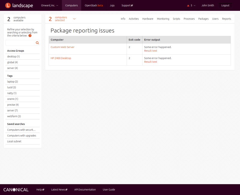 You can select one or more computers individually, or by using searches or tags. For each of those approaches, the starting place is the menu entry at the top of the screen. Clicking on it displays a list of all computers Landscape knows about.