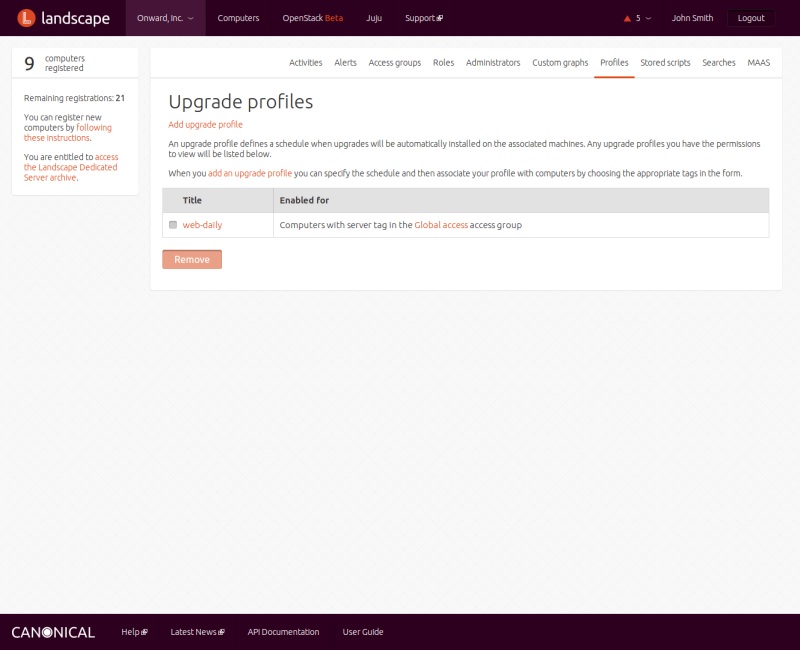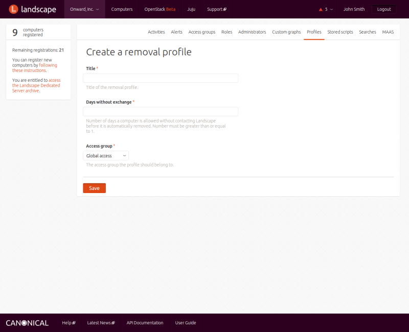 A removal profile defines a maximum number of days that a computer can go without exchanging data with the Landscape server before it is automatically removed. If more days pass than the profile's "Days without exchange", that computer will automatically be removed and the license seat it held will be released. This helps Landscape keep license seats open and ensure Landscape is not tracking stale or retired computer data for long periods of time. You can associate zero or more computers with each removal profile via tags to ensure those computers are governed by this removal profile. You can also associate a removal profile with an access group, which limits its use to only computers within the specified access group. You can manage removal profiles from the REMOVAL PROFILES link in the choice under your account.